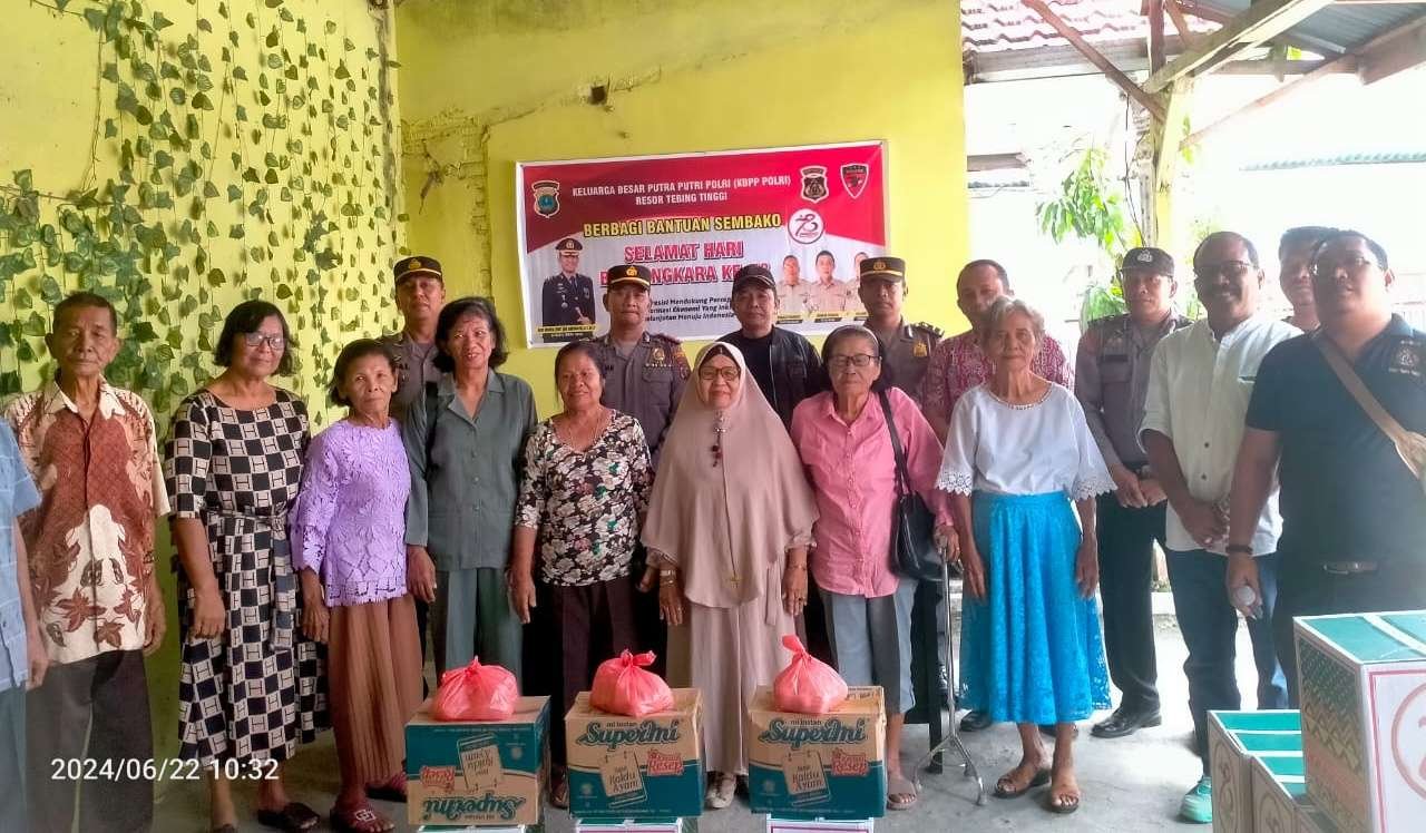 Polres Tebing Tinggi bersama Keluarga Besar Putra Putri Polri (KBPP Polri) Resor Tebing Tinggi melaksanakan kegiatan bakti sosial berupa pemberian paket sembako kepada Purnawirawan dan Warakauri Polri dalam rangka menyambut HUT Bhayangkara Ke-78, Sabtu (22/06/2024) pagi.