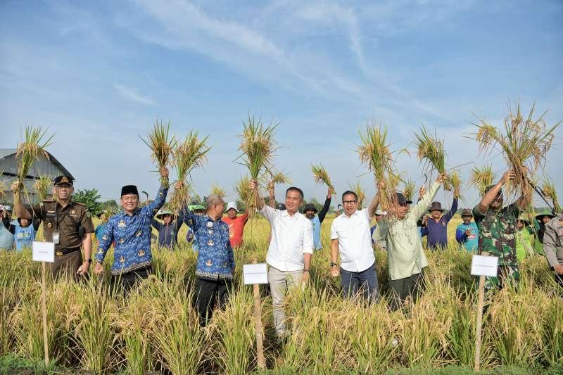 Penjabat Gubernur Jabar Bey Machmudin saat panen raya di Kecamatan Tukdana, Kabupaten Indramayu, Senin (18/11/2024).