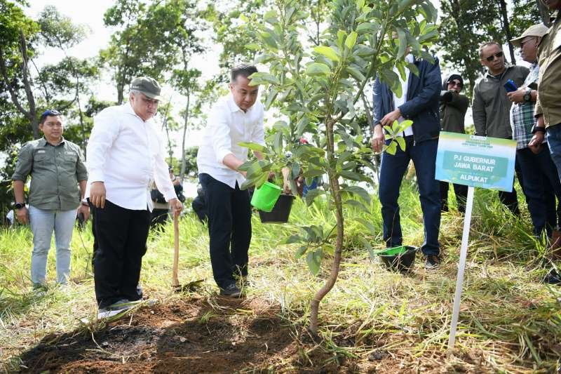 Penjabat Gubernur Jabar Bey Machmudin menanam pohon buah di kawasan Cikanyere, Desa Pakuon, Kecamatan Sukaresmi, Kabupaten Cianjur, Kamis (2/1/2025).