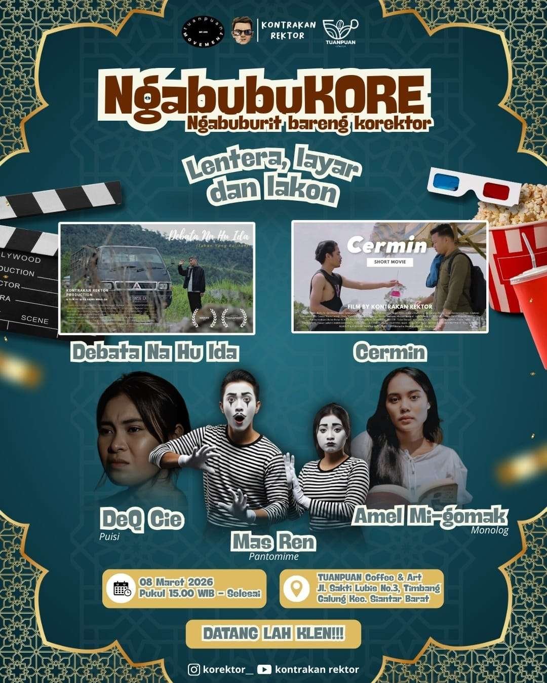 Kegiatan yang mengusung tema “Lentera, Layar dan Lakon” ini menampilkan pemutaran film pendek seperti Debata Na Hu Ida dan Cermin, yang diproduksi oleh komunitas kreatif Kontrakan Rektor. Selain pemutaran film, acara juga diisi dengan berbagai pertunjukan seni seperti pembacaan puisi oleh DeQ Cie, pantomim oleh Mas Ren, serta monolog oleh Amel Mi-gomak yang berhasil menarik perhatian para pengunjung.