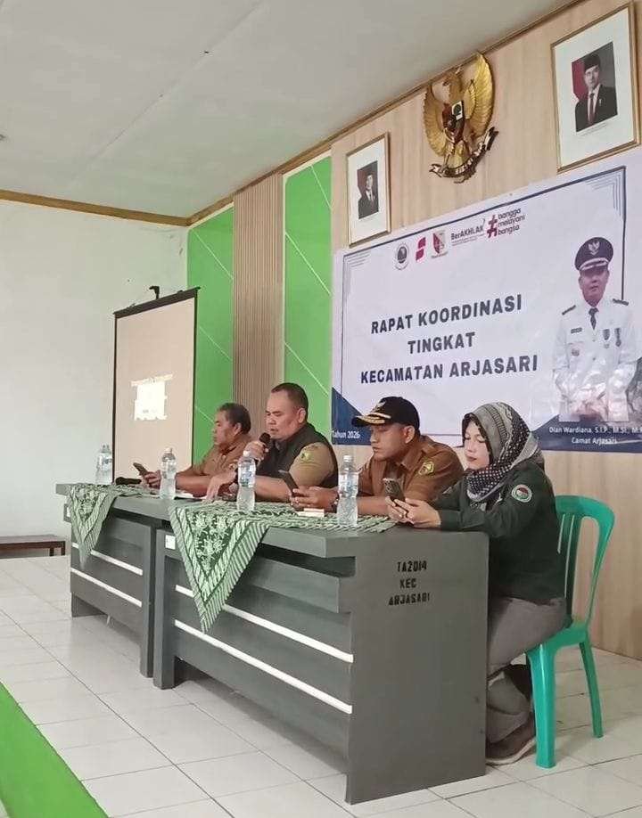 Kabupaten Bandung, IO – Camat Arjasari Dian Wardana, S.IP, M.Si, M.P, memimpin rapat koordinasi tingkat kecamatan Selasa 7/ 04/2026 di aula kecamatan yang digelar bersama para kepala desa, unsur kecamatan, dan pemangku kepentingan terkait.