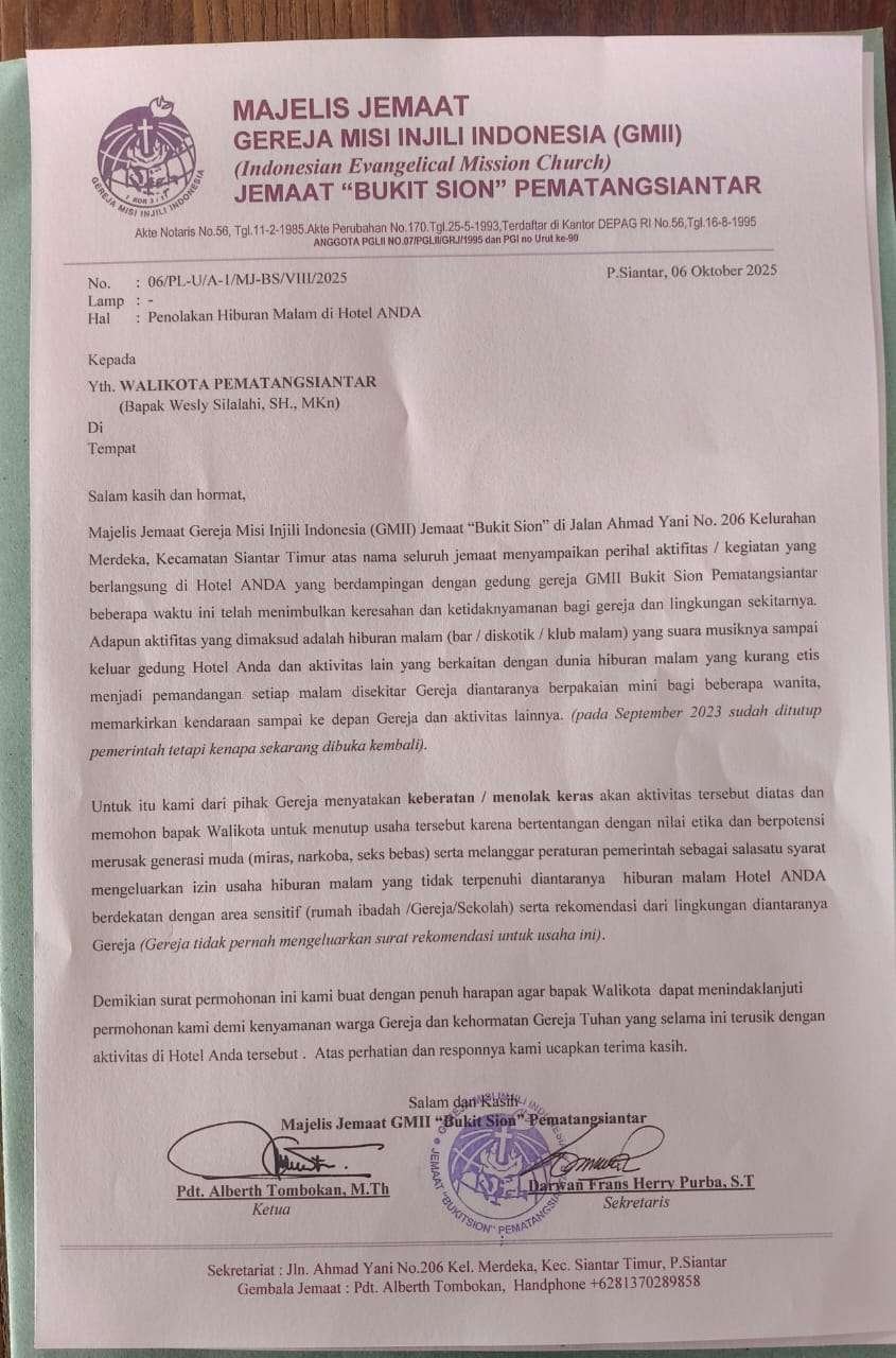 Surat pertama tertanggal 5 Agustus 2025 ditujukan kepada Pemerintah Kelurahan Merdeka, Kecamatan Siantar Timur, sementara surat kedua tertanggal 6 Oktober 2025 dikirim langsung kepada Wali Kota Pematangsiantar, Bapak Wesly Silalahi, SH., MKn. Dalam kedua surat itu, Majelis Jemaat GMII Bukit Sion dengan tegas menyampaikan keberatan terhadap kegiatan hiburan malam berupa bar, diskotik, dan karaoke di Tempat Hiburan Malam Anda Karaoke yang suaranya terdengar hingga ke area gereja. Aktivitas tersebut dinilai tidak pantas karena berdampingan langsung dengan rumah ibadah dan melanggar etika sosial serta aturan pemerintah terkait zonasi tempat usaha.
