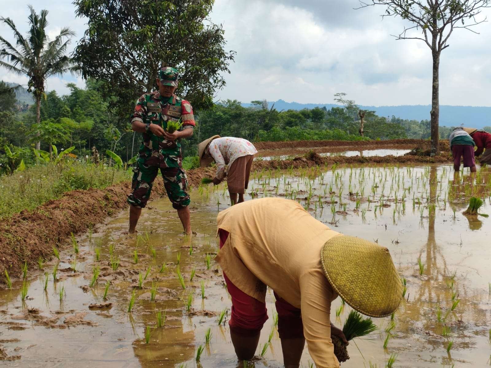 Kab. Tasikmalaya, Idisi Online – Kopka Juhenda Babinsa Koramil 1221/taraju, bersama kelompok tani panggungsari dalam rangka mendukung program pemerintah ketahanan pangan bersama Poktan mendorong petani menanam padi.