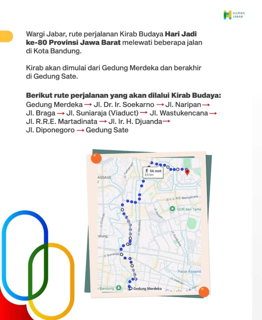 Kirab Budaya akan dimulai pukul 15.00 – 18.00 WIB, dengan rute yang akan dilalui, yakni Gedung Merdeka – Jalan Soekarno – Jalan Naripan – Jalan Braga – Jalan Suniaraja (Viaduct) – Jalan Wastukencana – Jalan R.R.E Martadinata – Jalan H. Juanda – Jalan Diponegoro – dan berakhir di Gedung Sate.