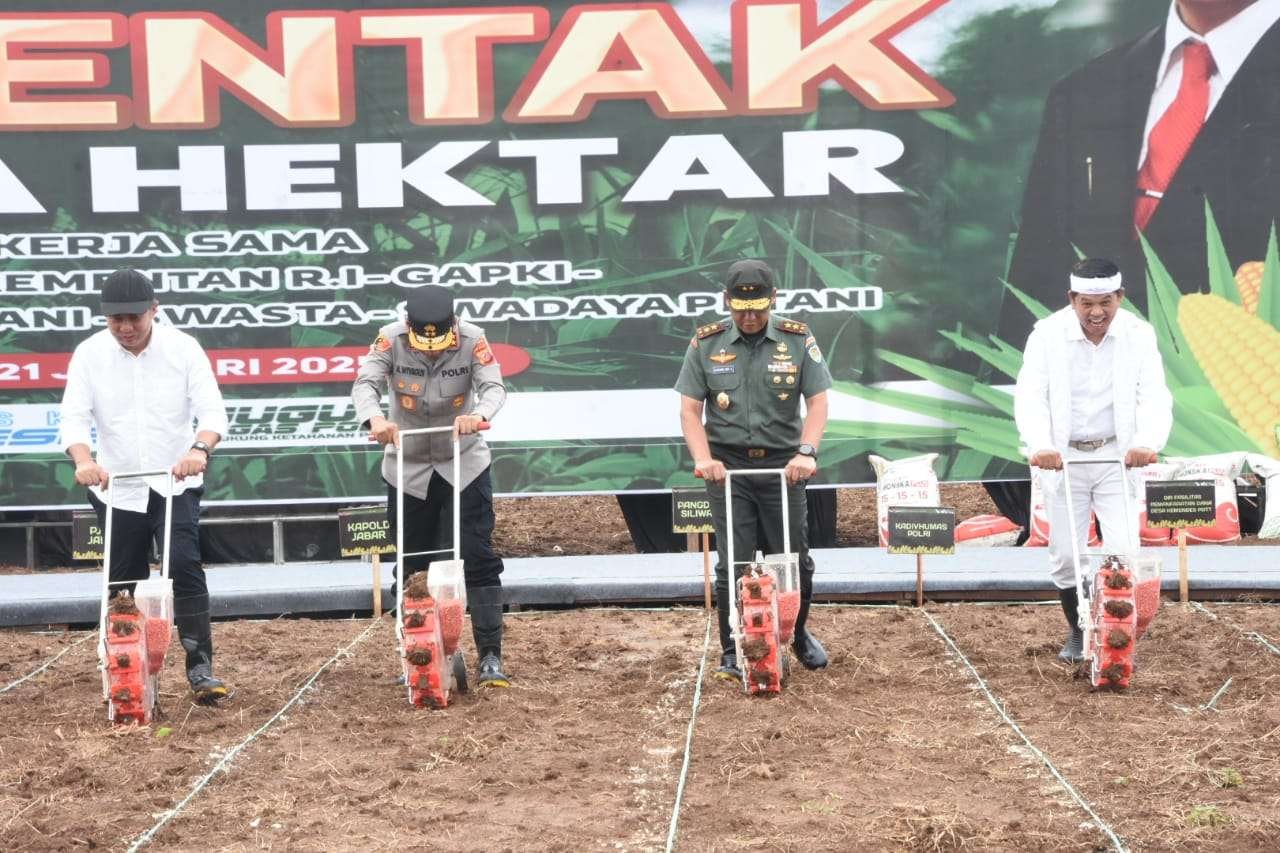 Subang, Idisi Online – Pangdam III/Siliwangi, Mayjen TNI Dadang Arif Abdurahman, S.E., M.Si., CHRMP., dan Forkopimda Jabar bersama Menteri Pertanian Dr. Ir. H. Andi Amran Sulaiman dan Kapolri Jenderal Polisi Drs. Listyo Sigit Prabowo, M.Si., melaksanakan tanam jagung serentak 1 juta hektar di Desa Karangmukti, Kecamatan Cipeundeuy, Kabupaten Subang, Jawa Barat, Selasa (21/01/2025).