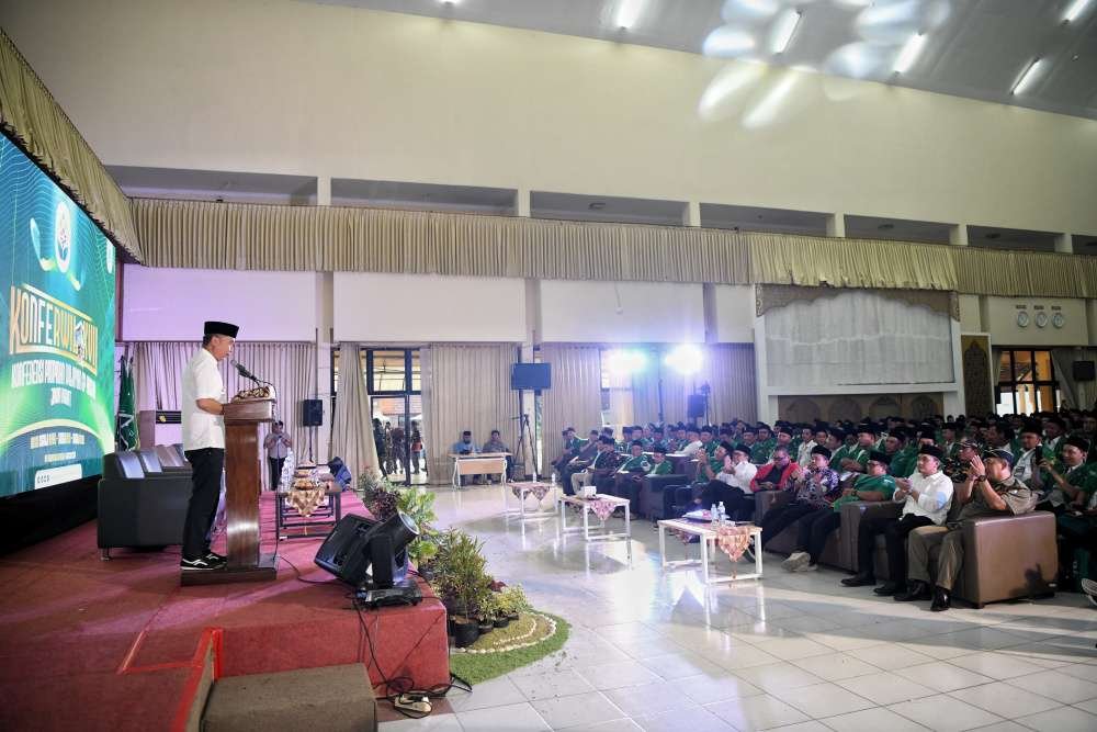 Penjabat Gubernur Jawa Barat Bey Machmudin memberikan sambutan pada Konferensi Wilayah (Konferwil) XVII/ 2024 GP Ansor Jabar di UPT Asrama Haji Kota Bekasi, Selasa (6/8/2024).(Foto: Biro Adpim Jabar)