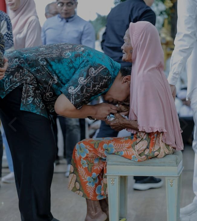 Plt. Kadisdik Jabar, Deden Saepul Hidayat menyalami nenek dalam peluncuran program “Nyaah ka Indung” di Pendopo Kab. Cianjur, Jumat (11/4/2025).