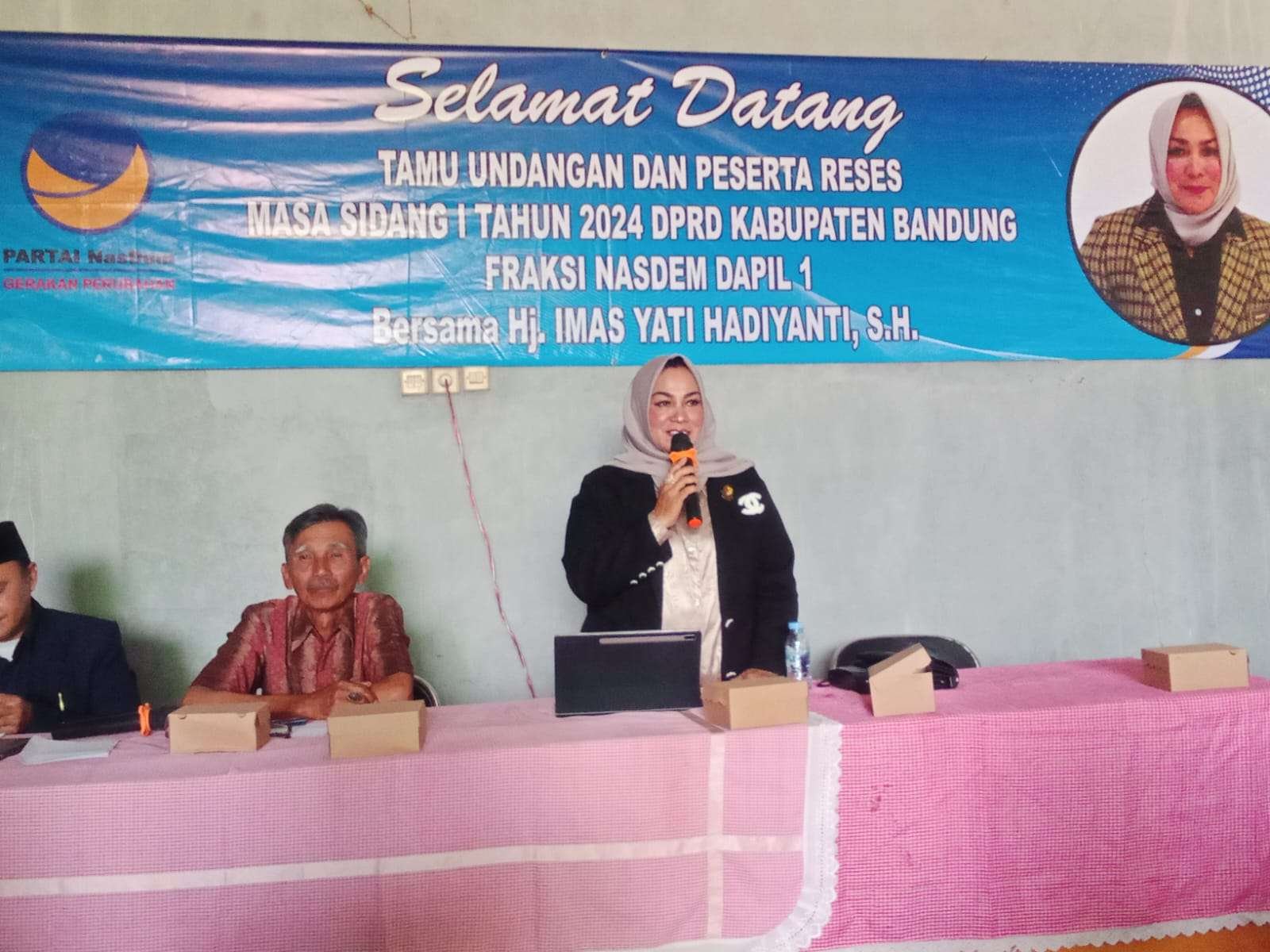 SOREANG, Idisi Online // Hj. Imas Yati Hadiyanti, SH.I., anggota DPRD Kabupaten Bandung asal Fraksi Nasdem Daerah Pemilihan (dapil) 1 meliputi kecamatan Rancabali, Ciwedey, Pasirjambu, Soreang dan Cangkuang. Kabupaten Bandung, laksanakan reses untuk masa sidang ke-1 tahun 2024.