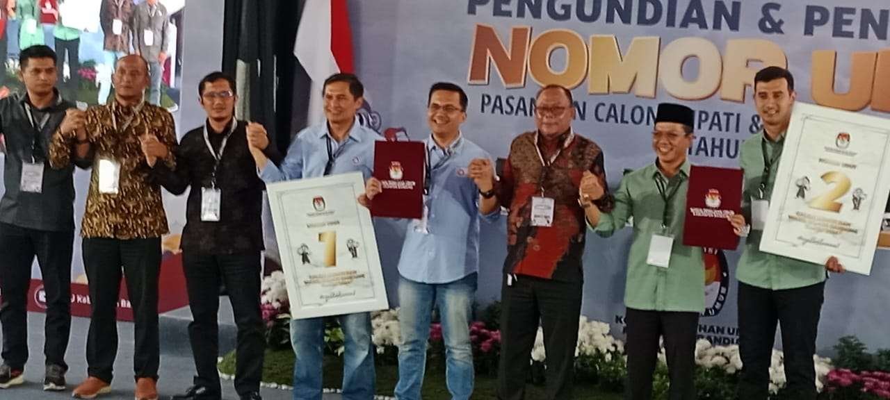 Dari pengundian nomor urut yang telah dilaksanakan hari ini, Pasangan Calon Bupati dan Wakil Bupati Bandung BEDAS yaitu Dr. HM Dadang Supriatna, S.Ip., M.Si dengan Ali Syakieb mendapatkan nomor urut 2 dan Pasangan Calon Bupati dan Wakil Bupati Bandung Alus Pisan yaitu H. Sahrul Gunawan, SE., MAG., dengan H. Gungun Gunawan mendapatkan nomor urut 1.